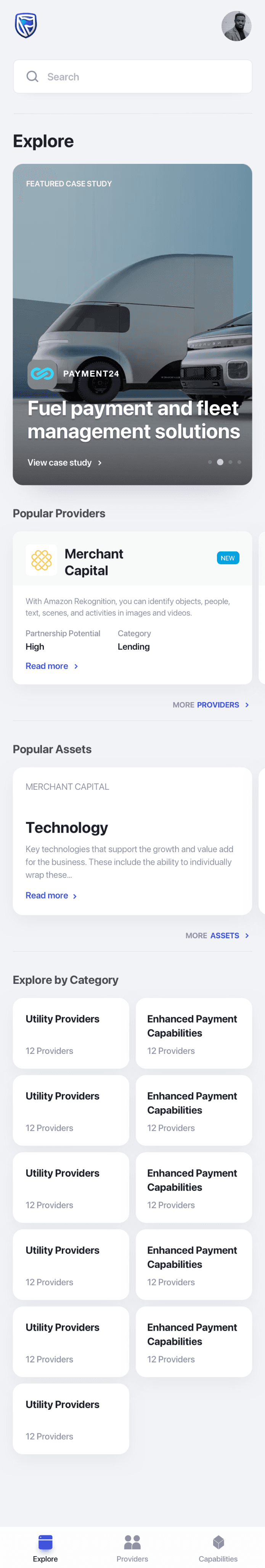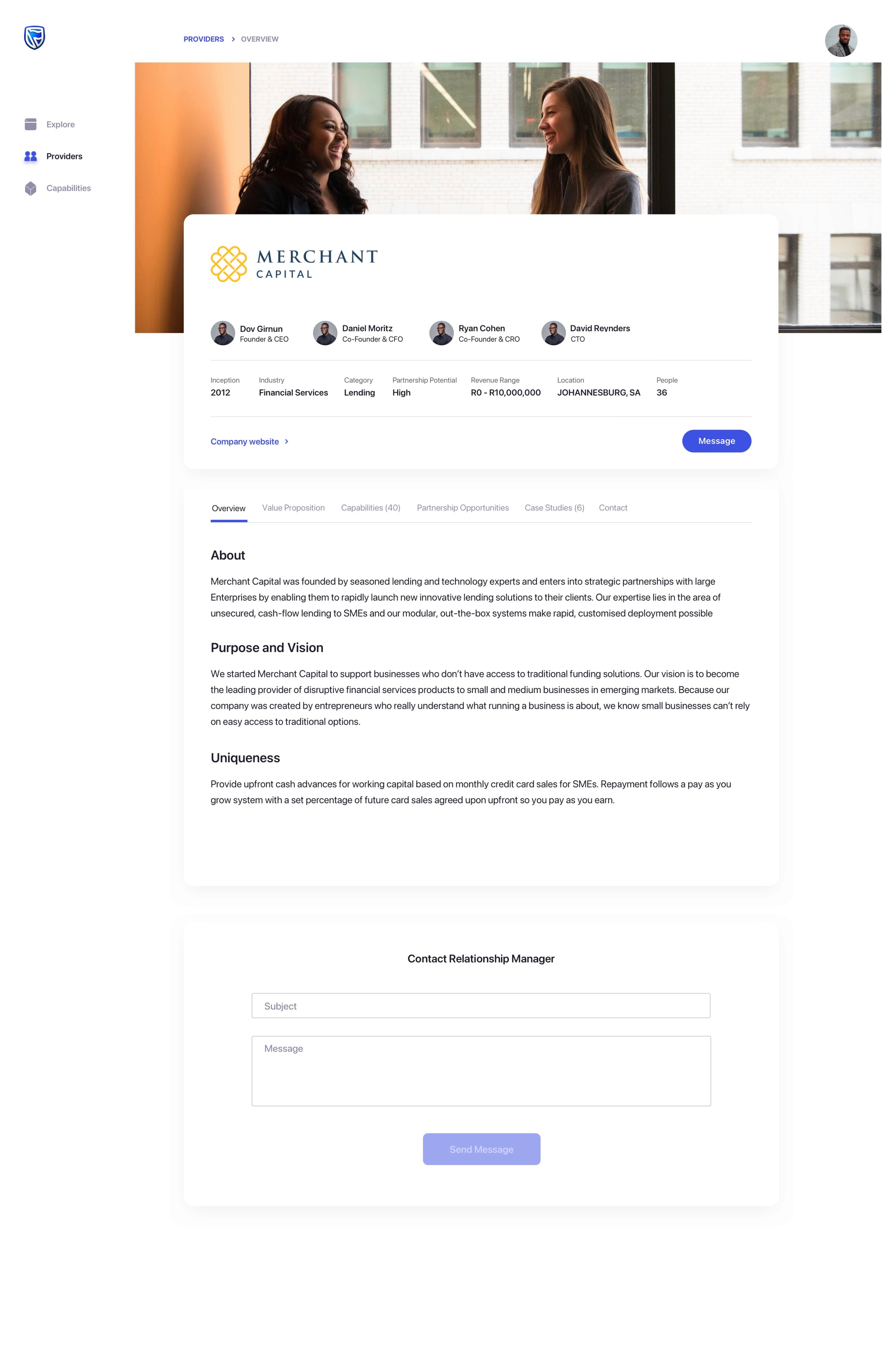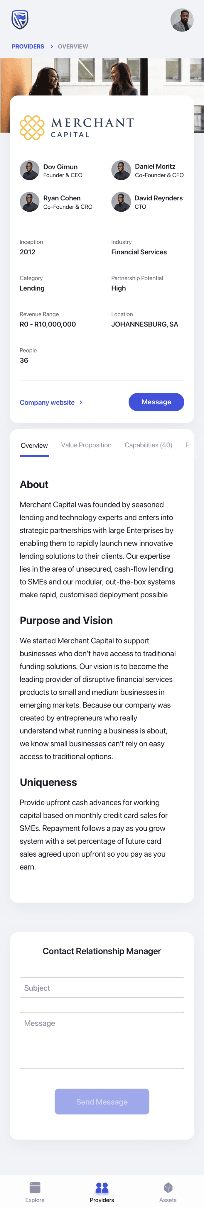 him suggestions about lending business - providers. He selects the suggested provider and lands up to the detail page of the lending partner. He reads through the information and then navigates to the case studies to read about previous engagements.