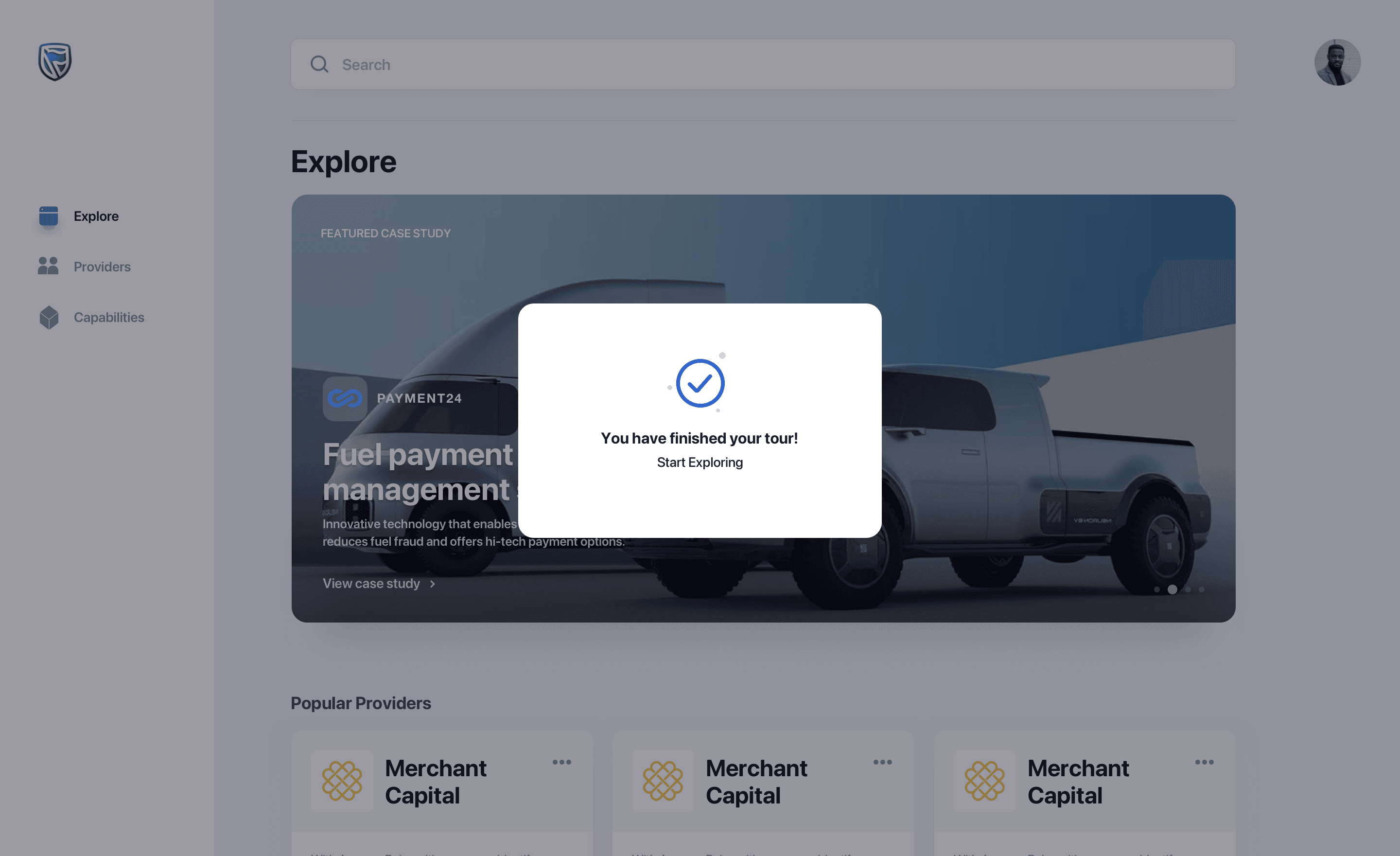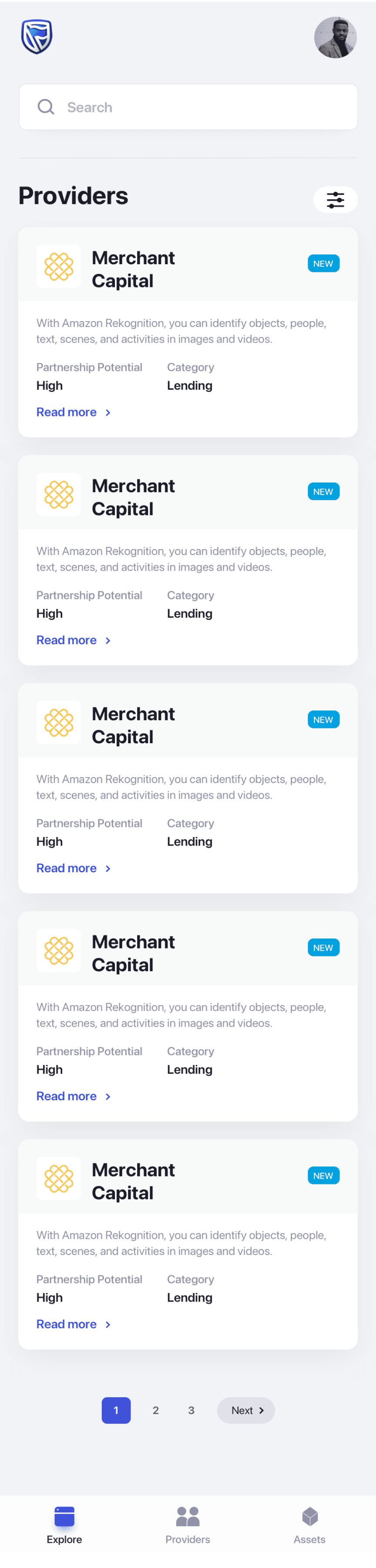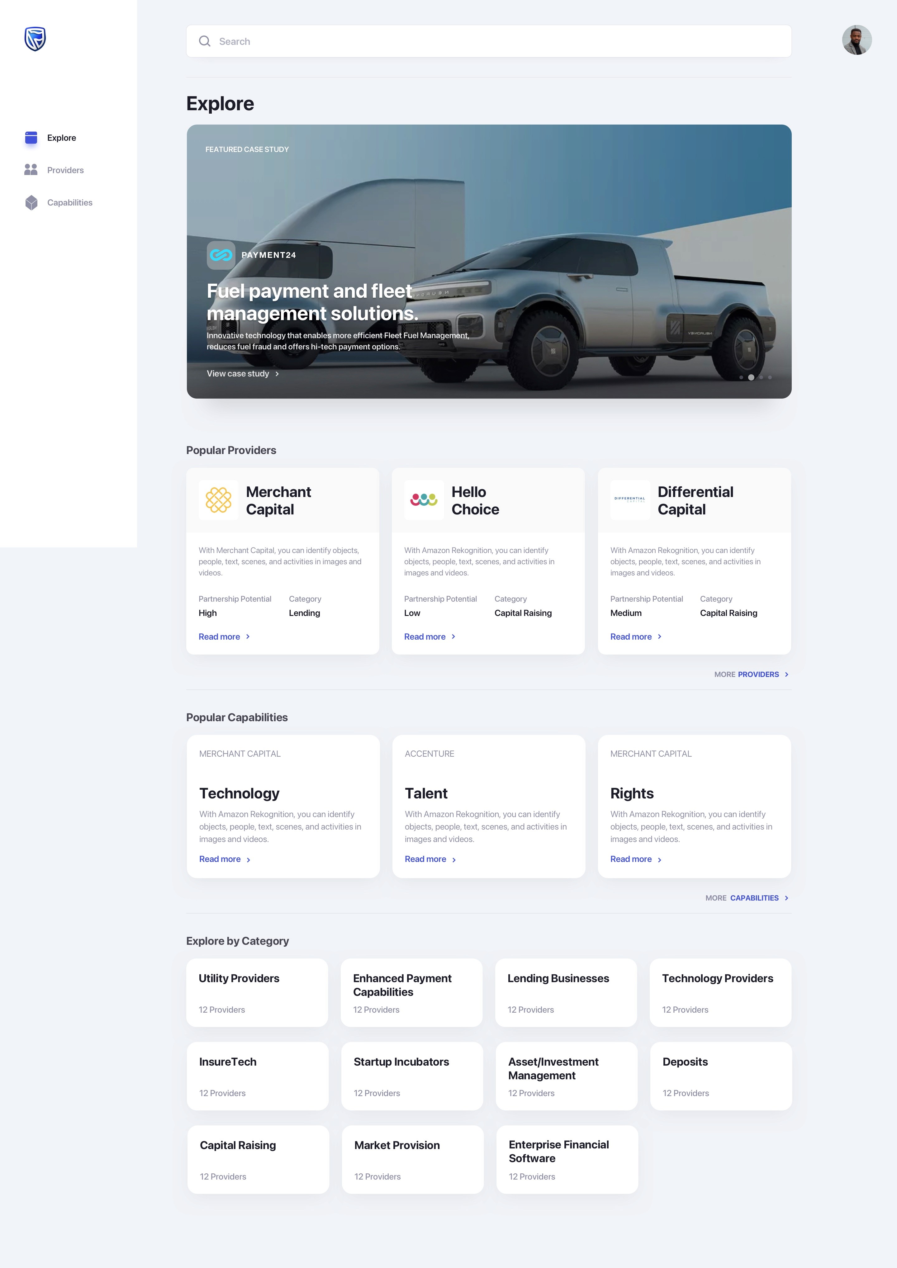 him suggestions about lending business - providers. He selects the suggested provider and lands up to the detail page of the lending partner. He reads through the information and then navigates to the case studies to read about previous engagements.