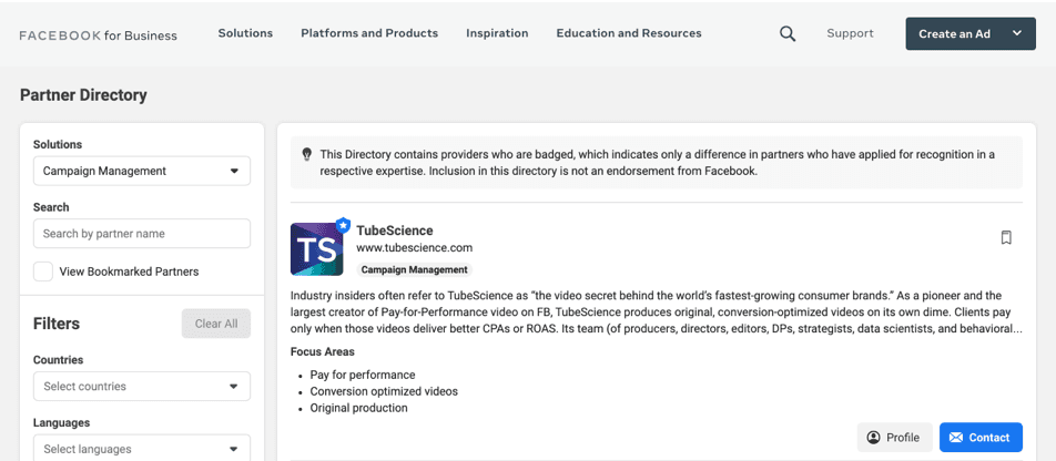 Facebook directory is a 2 layer directory with a search page, search result component and a overlay of partner details.